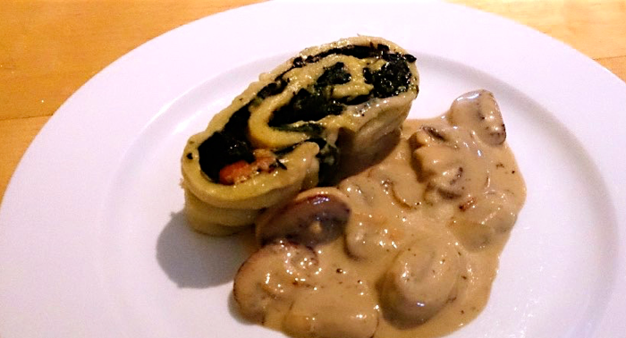 - Den Nudelteig auf bemehltem Geschirrtuch ausrollen (30 x 40 cm). Gemüse darauf verteilen. Käse darüberreiben. Teig mit Hilfe des Tuches (wie bei einer Bisquite-Rolle) aufrollen. Küchentuch an den Enden mit Küchengarn zubinden. Nudelrolle in kochendem Salzwasser ca. 30 Minuten garen.