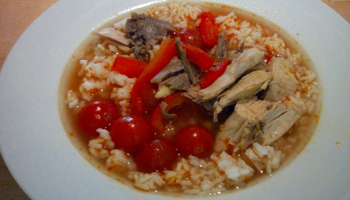 - Von der Brühe zwei Liter und 400 g Hühnerfleisch abnehmen, Tomaten und Paprikaschoten dazugeben, mit Salz und Cayennepfeffer abschmecken und heiß in vorgewärmten Tellern servieren. Nach Wunsch mit frischer, glatter Petersilie garnieren.