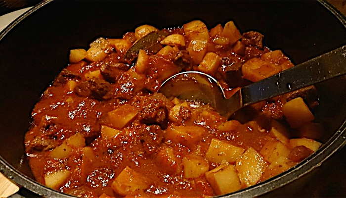 - Kartoffeln nach der Garzeit des Rindfleisch hinzufügen, eventuell noch Wasser nachgießen und nochmals 20-30 Minuten köcheln lassen. Das Fleisch und die Kartoffeln sollten weich sein und die Sauce eine sämige Konsistenz haben. Mit den Gewürzen kräftig abschmecken und servieren.